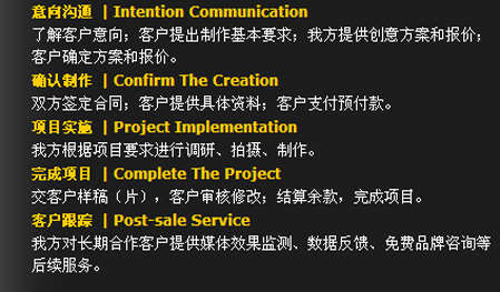 意向溝通 | Intention Communication 十年磨一劍,經(jīng)典影視已經(jīng)成為業(yè)內(nèi)規(guī)模化品牌傳播專業(yè)機構(gòu)。   思想力——Idea Create Value! 品牌傳播相信:只有與眾不同的創(chuàng)意,才能為客戶創(chuàng)造價值!出色的藝術是創(chuàng)意品牌的保證;我們是客戶的伙伴,我們并肩作戰(zhàn),只為創(chuàng)造一個偉大的品牌。   智慧力——創(chuàng)作團隊 創(chuàng)意總監(jiān)——創(chuàng)意來自生活,高于生活 美術指導——身手敏捷,思想敏銳,具有獨特的美術嗅覺 資深策劃——思維縝密而又膽識過人,常常給人意外之喜 經(jīng)典影視.品牌傳播,采用國際化的Team作業(yè)模式——   保證力——作業(yè)流程 我們一直相信,只有科學、規(guī)范的作業(yè)流程作為運作保障,優(yōu)秀的創(chuàng)意才能得以完美的實施。在經(jīng)典影視,我們一直秉承——策略精準 . 創(chuàng)意新銳 . 執(zhí)行出色。